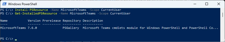 Install-PSResource -Name MicrosoftTeams -Scope CurrentUser