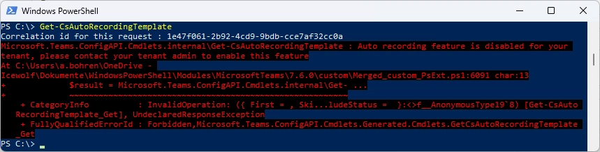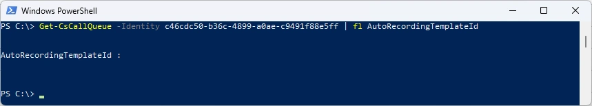 Get-CsCallQueue -Identity c46cdc50-b36c-4899-a0ae-c9491f88e5ff | fl AutoRecordingTemplateId