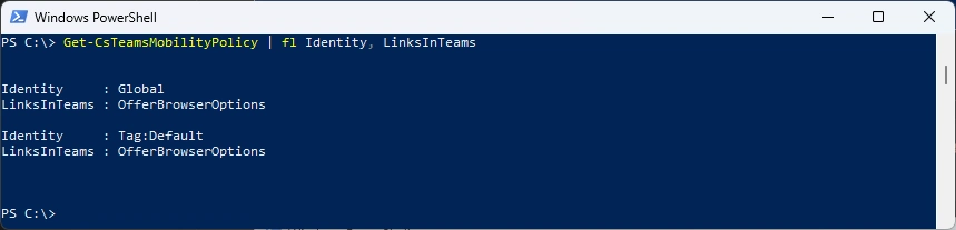 Get-CsTeamsMobilityPolicy | fl Identity, LinksInTeams