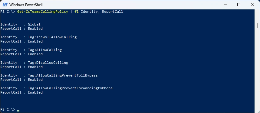 Get-CsTeamsCallingPolicy | fl Identity, ReportCall