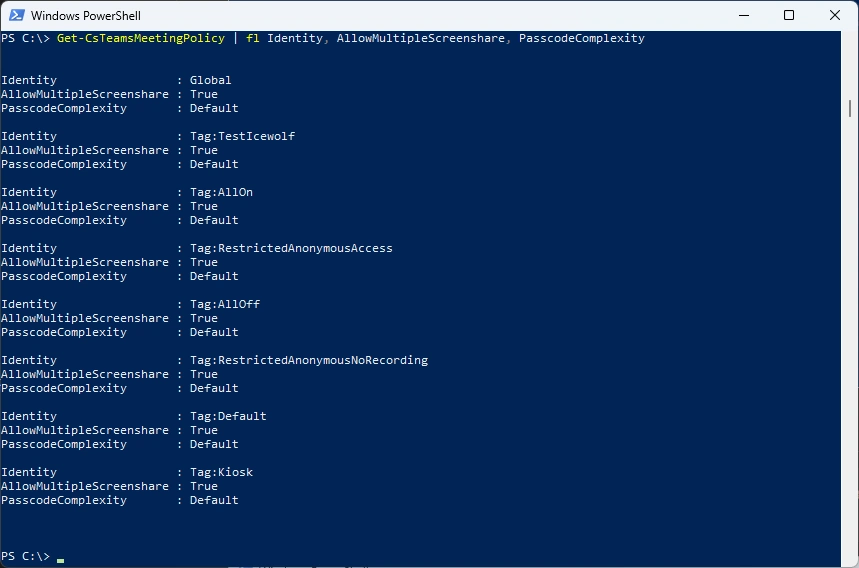 Get-CsTeamsMeetingPolicy | fl Identity, AllowMultipleScreenshare, PasscodeComplexity