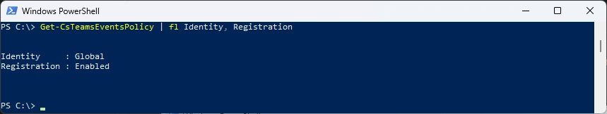 Get-CsTeamsEventsPolicy | fl Identity, Registration