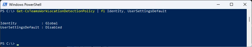 Get-CsTeamsWorkLocationDetectionPolicy | fl Identity, UserSettingsDefault