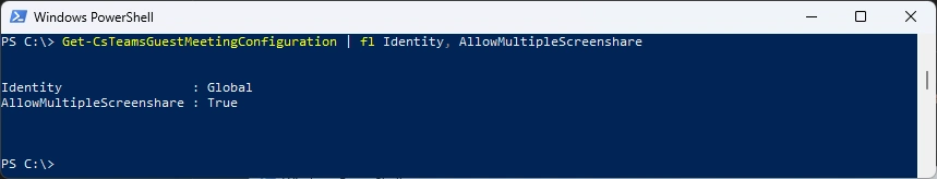 Get-CsTeamsGuestMeetingConfiguration | fl Identity, AllowMultipleScreenshare