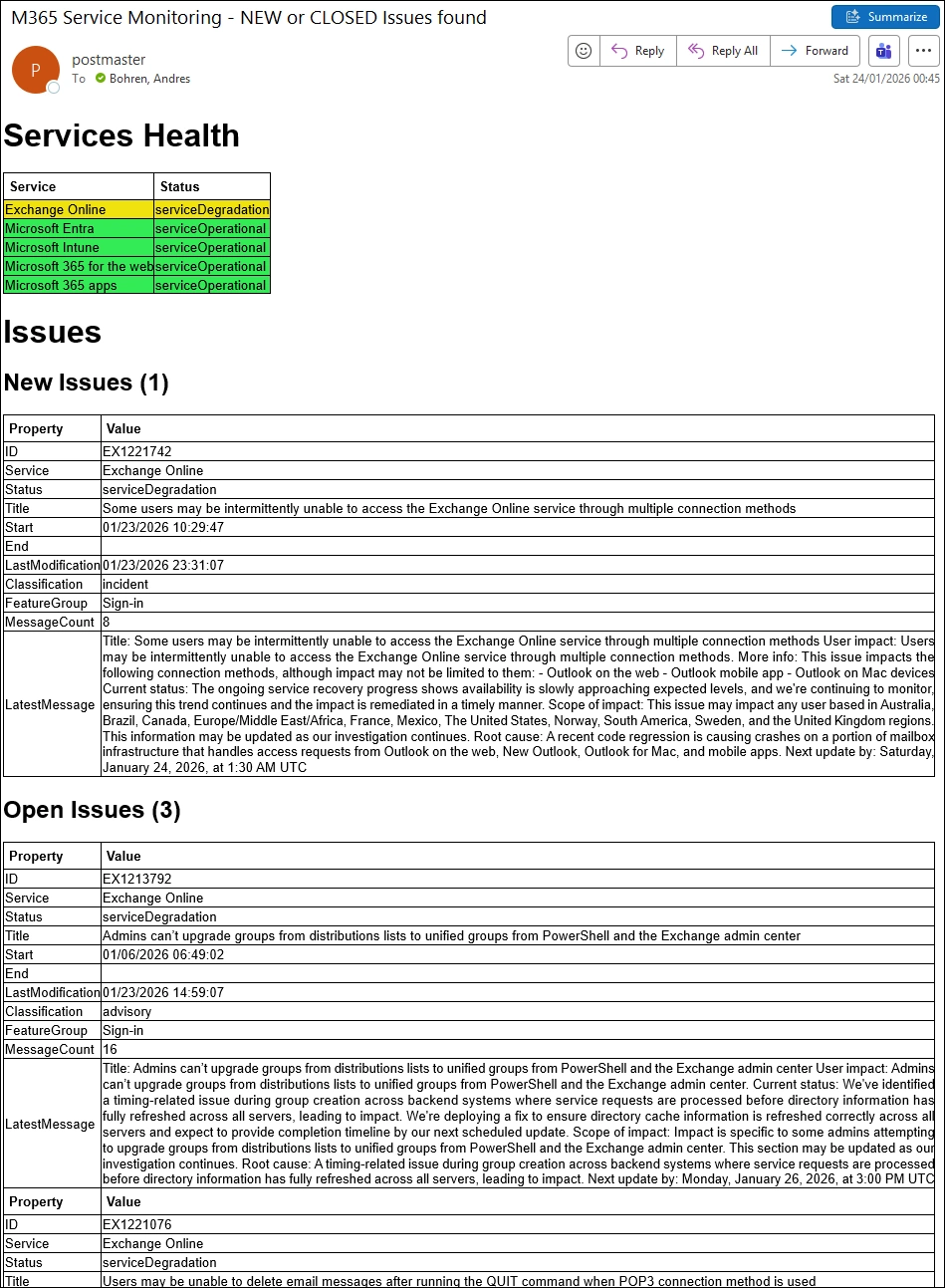 I think it’s a good start if you don’t have any other Monitoring Solution available. The cool thing is you can select the Services you’re interested in - usually not all Services are deployed at a customer. And you only get an Email for NEW or COSED Issues.