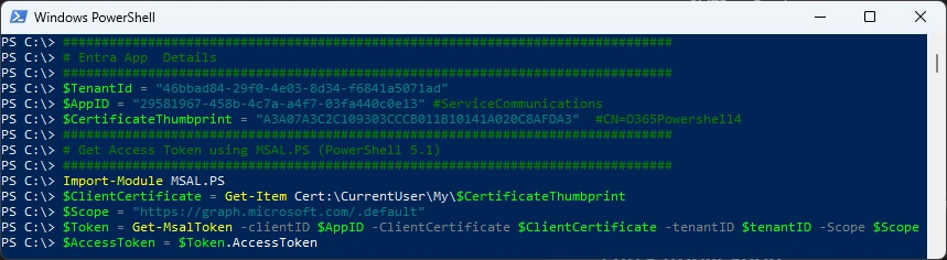 $Token = Get-MsalToken -clientID $AppID -ClientCertificate $ClientCertificate -tenantID $tenantID -Scope $Scope