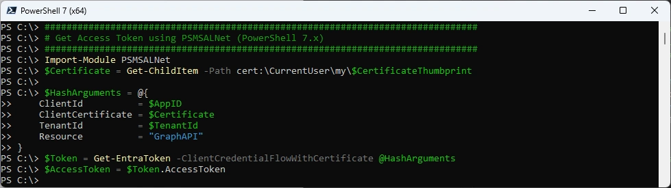 $Token = Get-EntraToken -ClientCredentialFlowWithCertificate @HashArguments