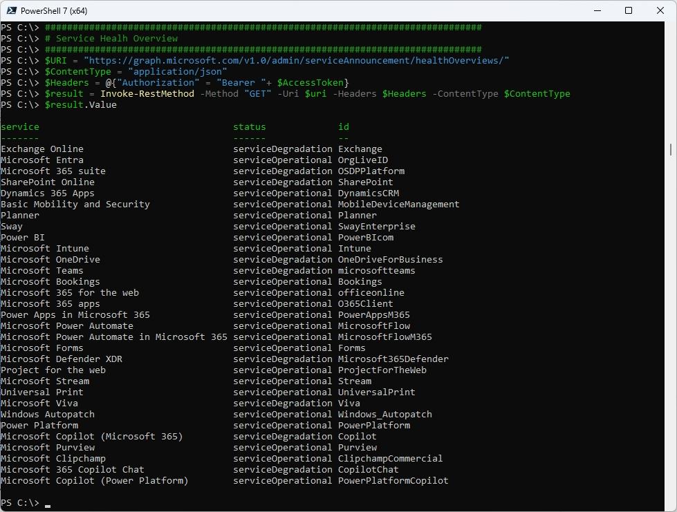 $URI = "https://graph.microsoft.com/v1.0/admin/serviceAnnouncement/healthOverviews/"