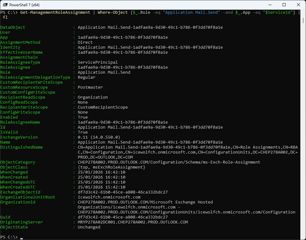 # Get-ManagementRoleAssignment | Where-Object {$_.Role -eq "Application Mail.Send" -and $_.App -eq "$ServiceId"}
