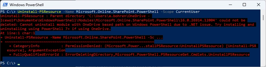 In the last few weeks i’ve noticed that uninstalling some Modules seems to have Problems. Might be it’s related to the CurrentUser Scope that is redirected to OneDrive. Anyone else seeing this?