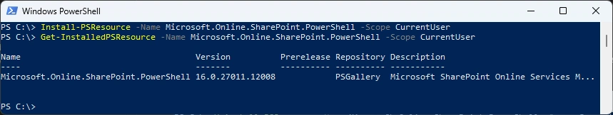 Install-PSResource -Name Microsoft.Online.SharePoint.PowerShell -Scope CurrentUser
