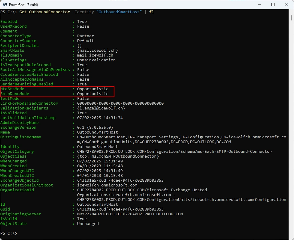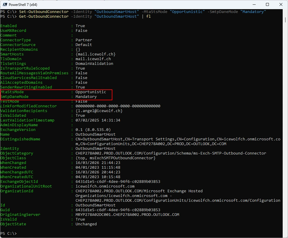 Set-OutboundConnector -Identity "OutboundSmartHost" -MtaStsMode "Opportunistic" -SmtpDaneMode "Mandatory"
