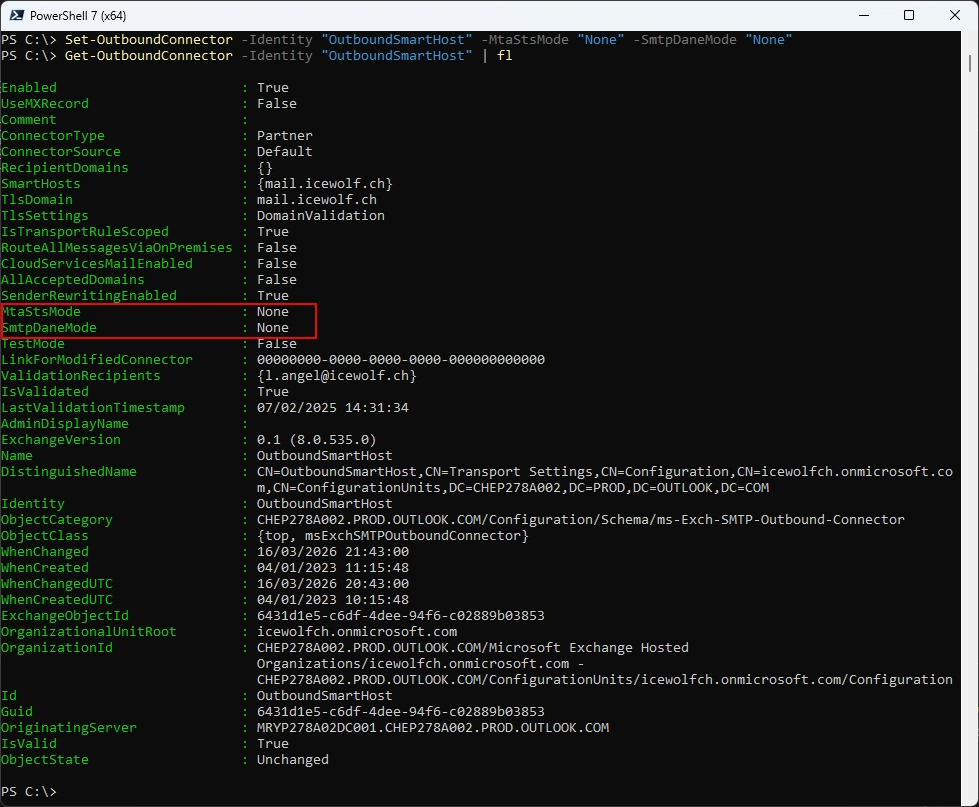 Set-OutboundConnector -Identity "OutboundSmartHost" -MtaStsMode "None" -SmtpDaneMode "None"