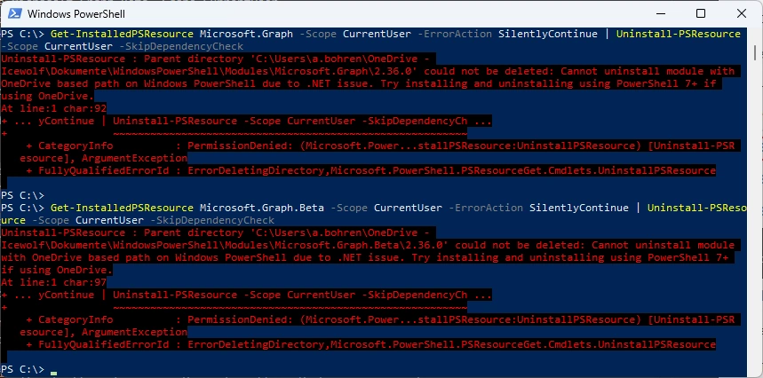 In the last few months i’ve noticed that uninstalling some Modules seems to have Problems. Might be it’s related to the CurrentUser Scope that is redirected to OneDrive. Anyone else seeing this?