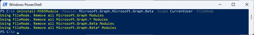 Uninstall-M365Module -Modules Microsoft.Graph,Microsoft.Graph.Beta -Scope CurrentUser -FileMode
