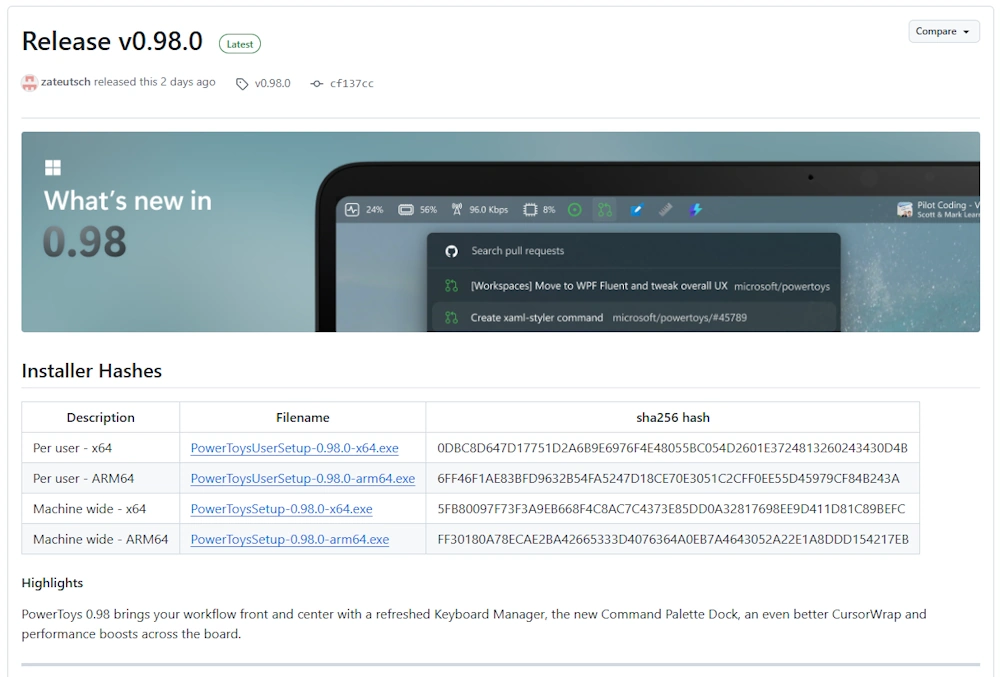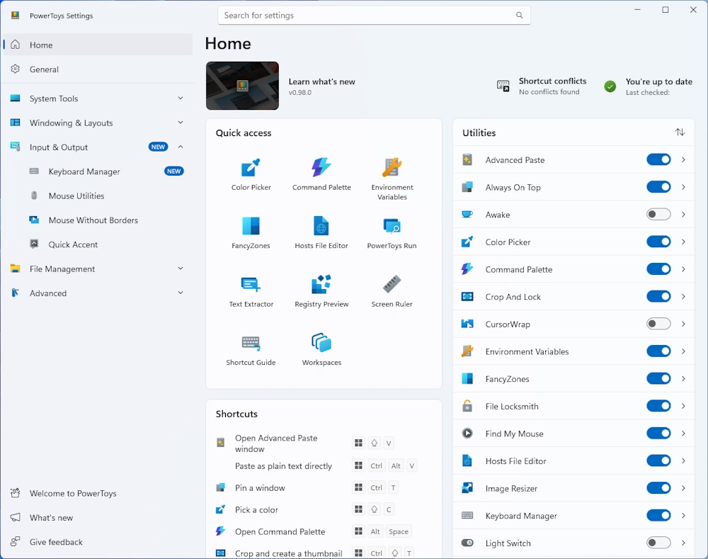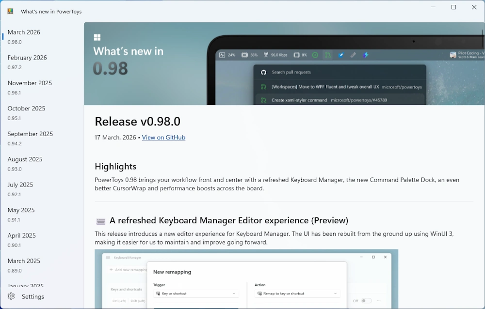 - PowerToys 0.98 brings your workflow front and center with a refreshed Keyboard Manager, the new Command Palette Dock, an even better CursorWrap and performance boosts across the board.