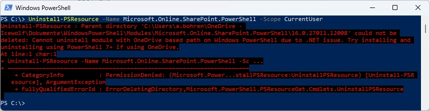 In the last few months i’ve noticed that uninstalling some Modules seems to have Problems. Might be it’s related to the CurrentUser Scope that is redirected to OneDrive. Anyone else seeing this?
