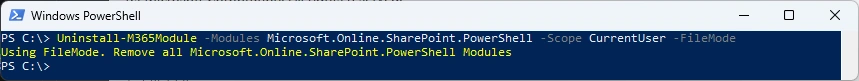 Uninstall-M365Module -Modules Microsoft.Online.SharePoint.PowerShell -Scope CurrentUser -FileMode