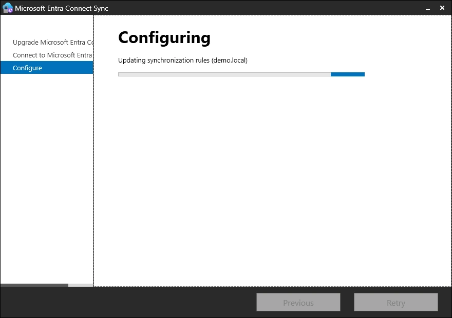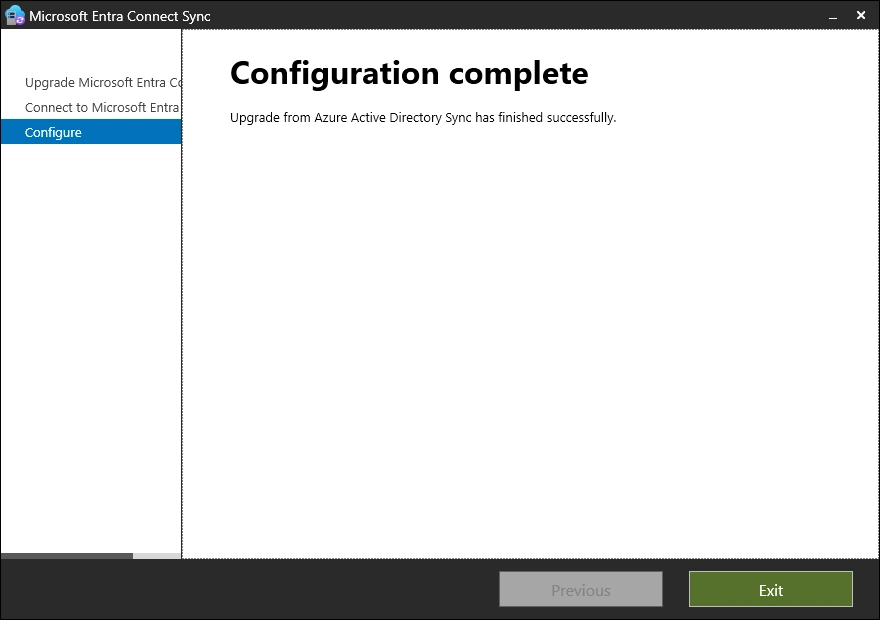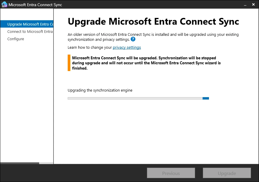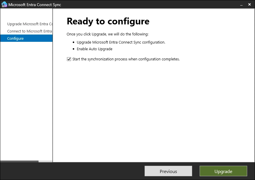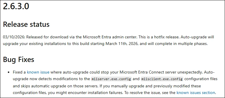 Bug Fixes Fixed a known issue where auto-upgrade could stop your Microsoft Entra Connect server unexpectedly. Auto-upgrade now detects modifications to the miiserver.exe.config and miisclient.exe.config configuration files and skips automatic upgrade on those servers. If you manually upgrade and previously modified these configuration files, you might encounter installation failures. To resolve the issue, see the known issues section.