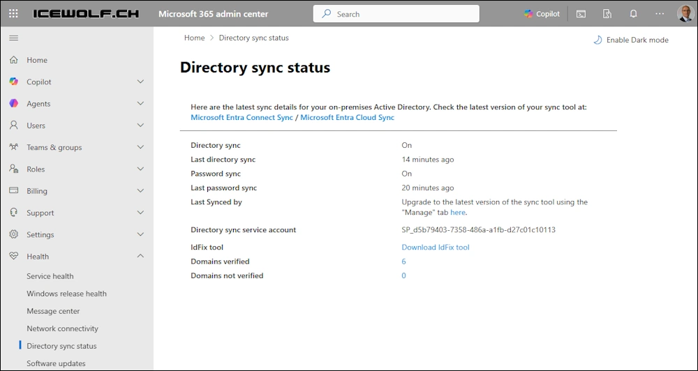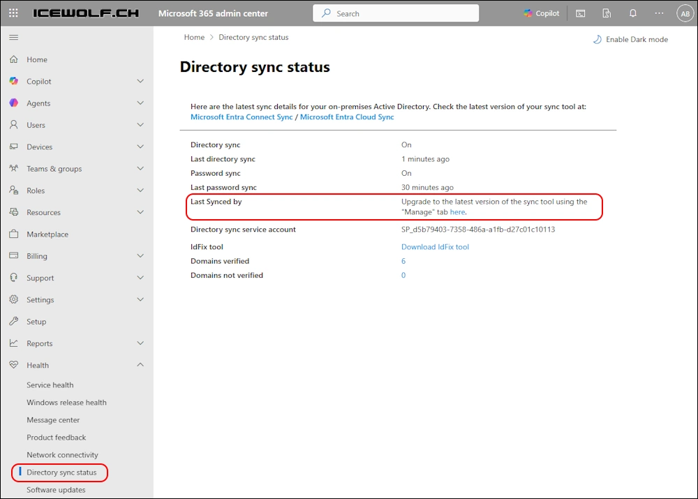Check Entra Connect Sync in M365 Admin Center Directory sync status
