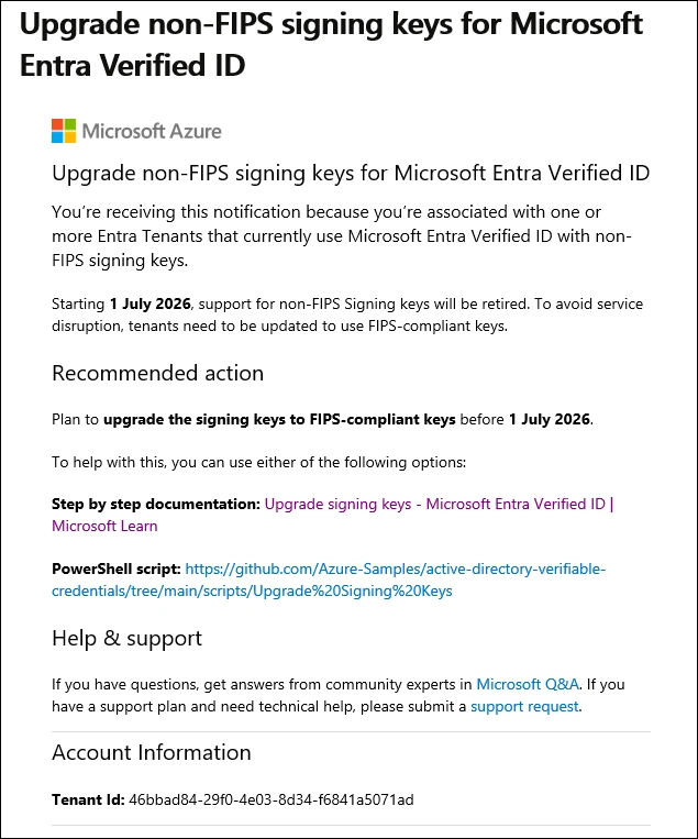 This Morning i was greeted with a Mail from Microsoft, to upgrade my Signing Key of Microsoft Entra Verified Id to a FIPS-compliant key.