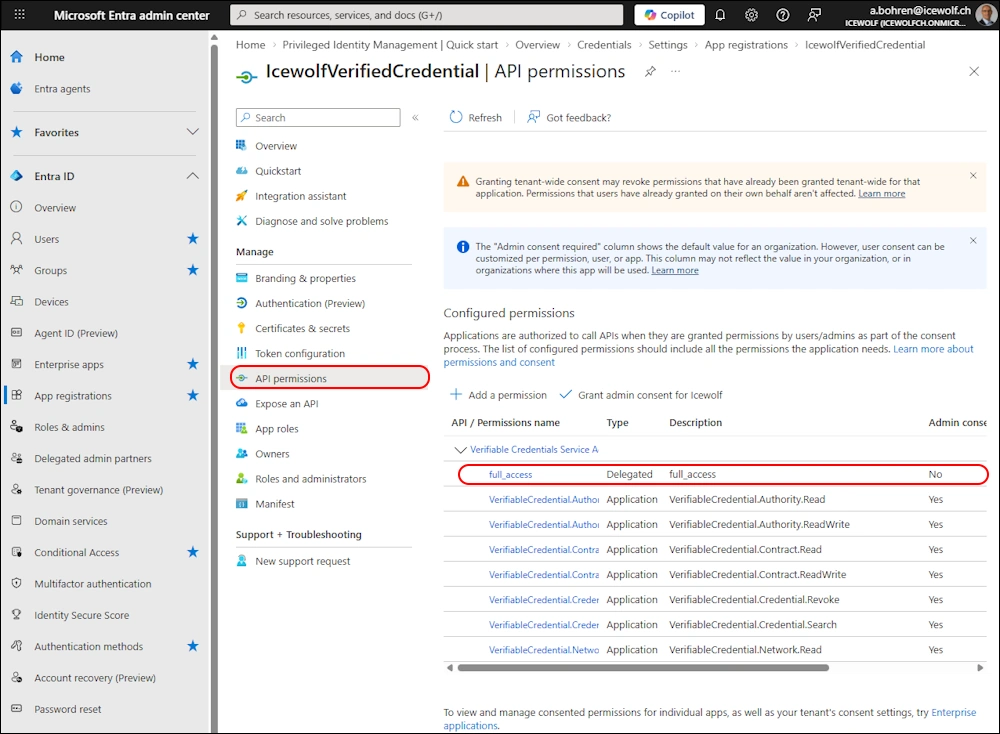 Permissions: Verifiable Credentials Service Admin API permission > full_access