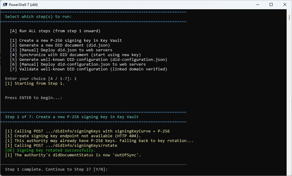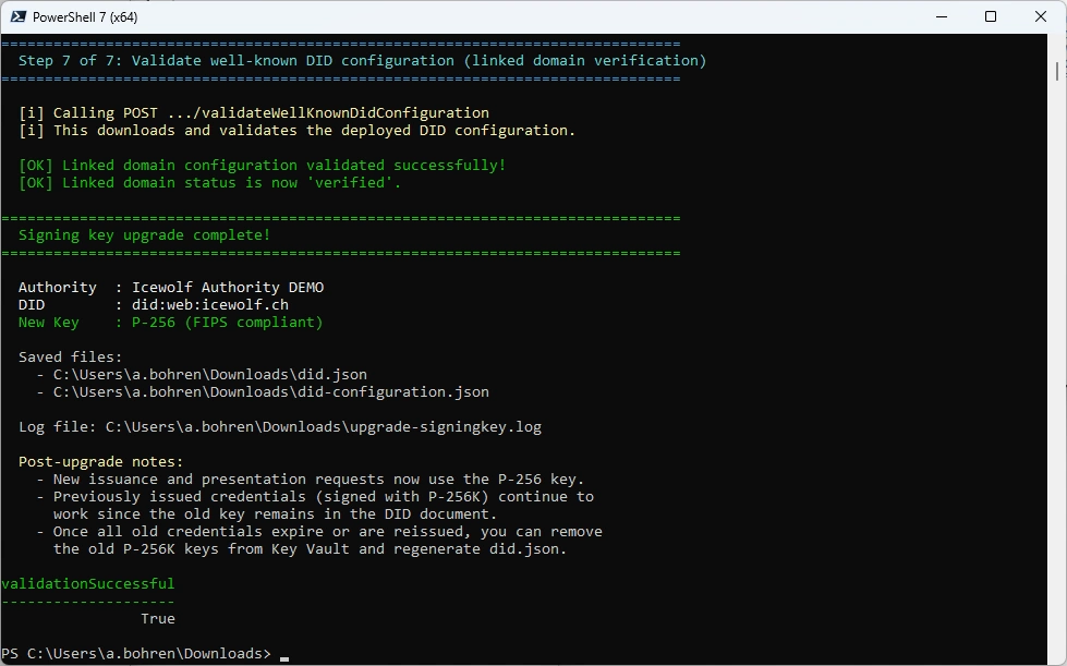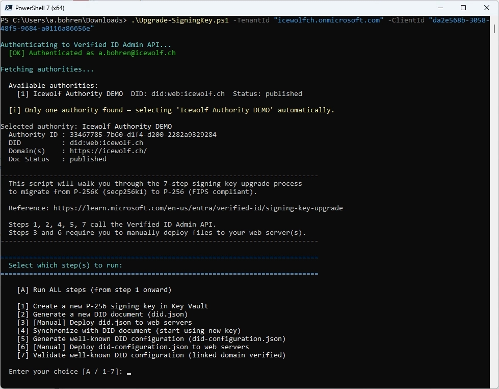 .\Upgrade-SigningKey.ps1 -TenantId "icewolfch.onmicrosoft.com" -ClientId "da2e568b-3058-48f5-9684-a0116a86656e"