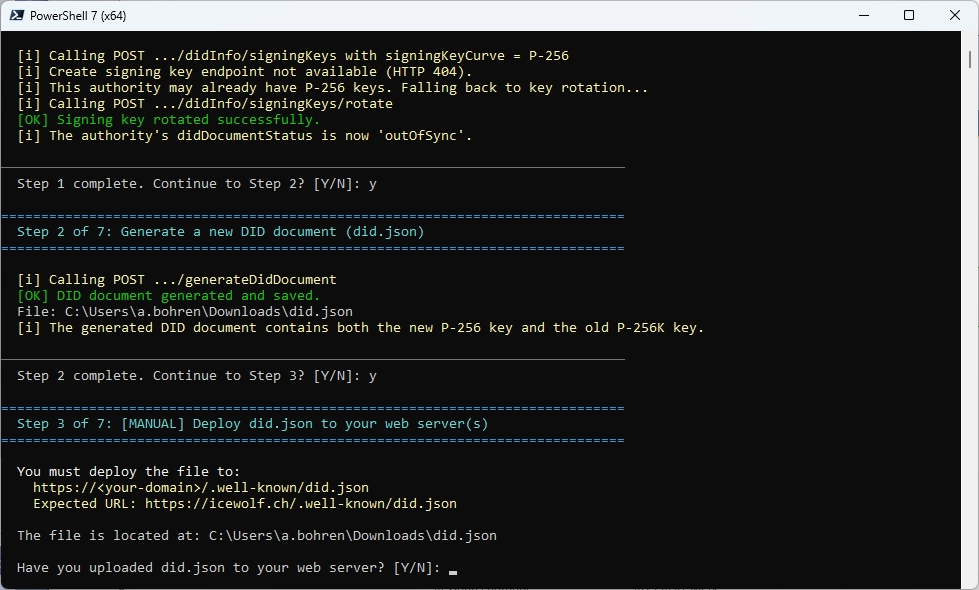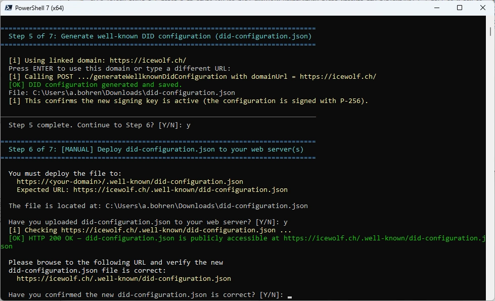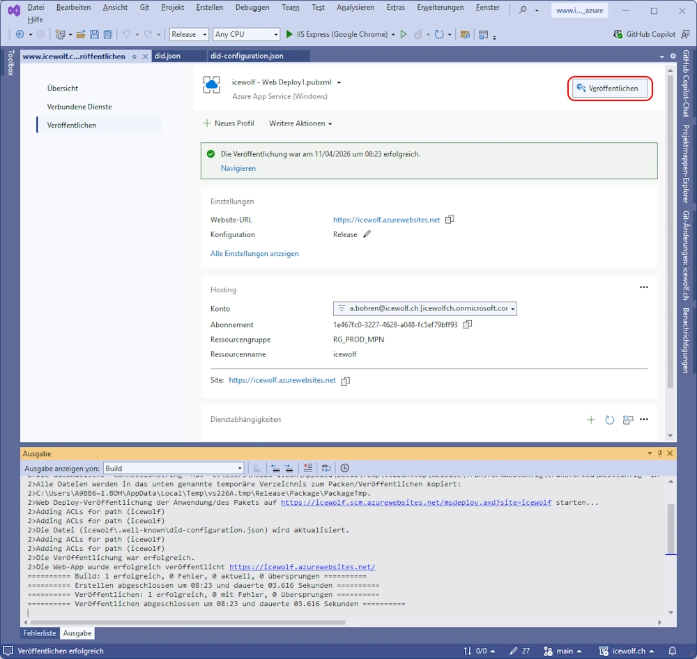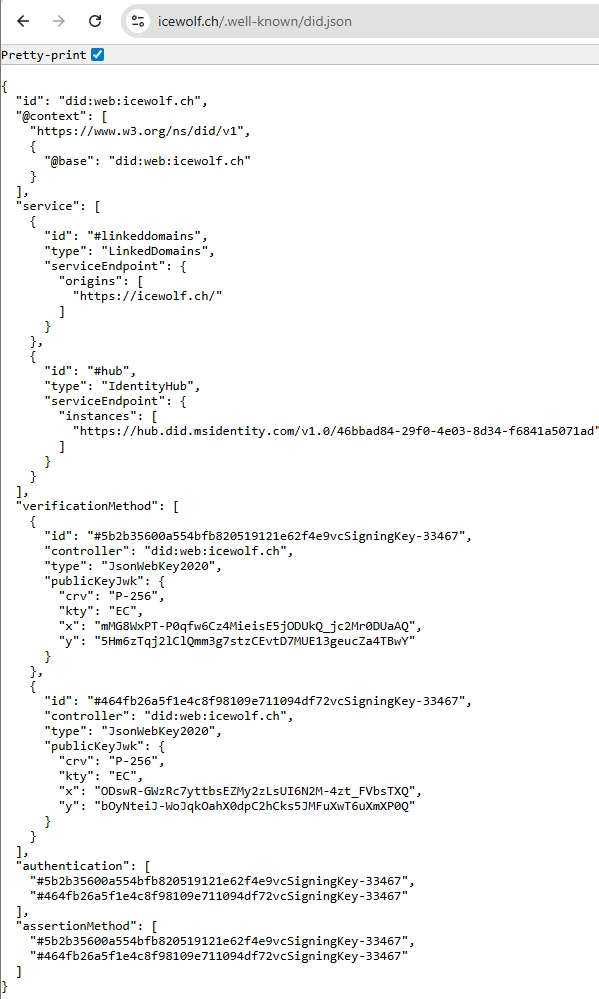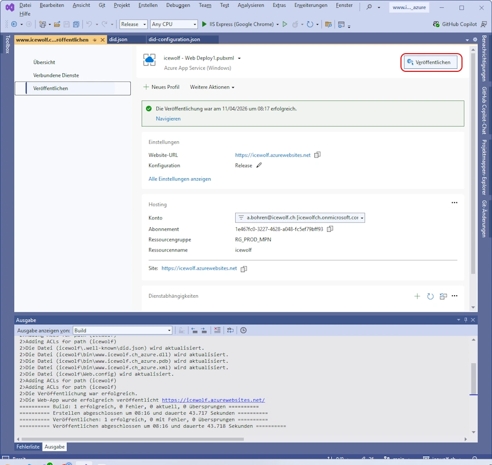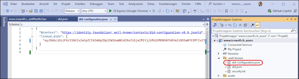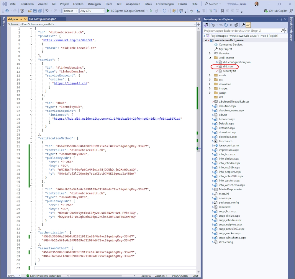 The did.json file has to be published on my Webserver for icewolf.ch. I use Azure App Service and change the did.json here
